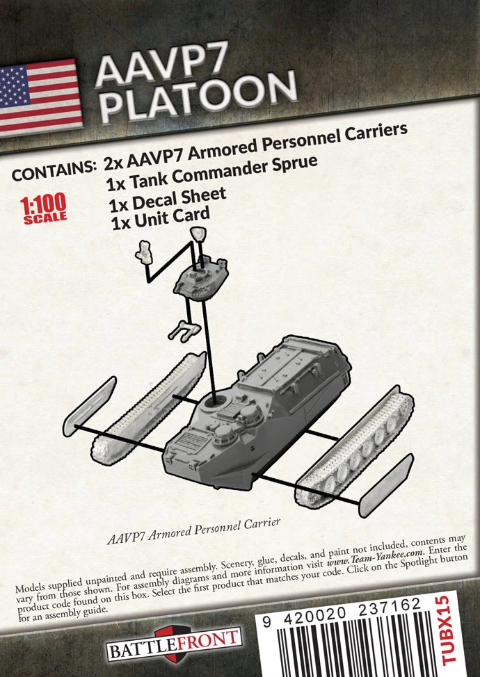 Contains two resin and metal AAVP-7 Trasports, one decal sheet, one tank commander sprue and one unit card