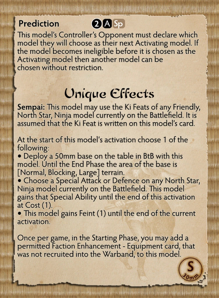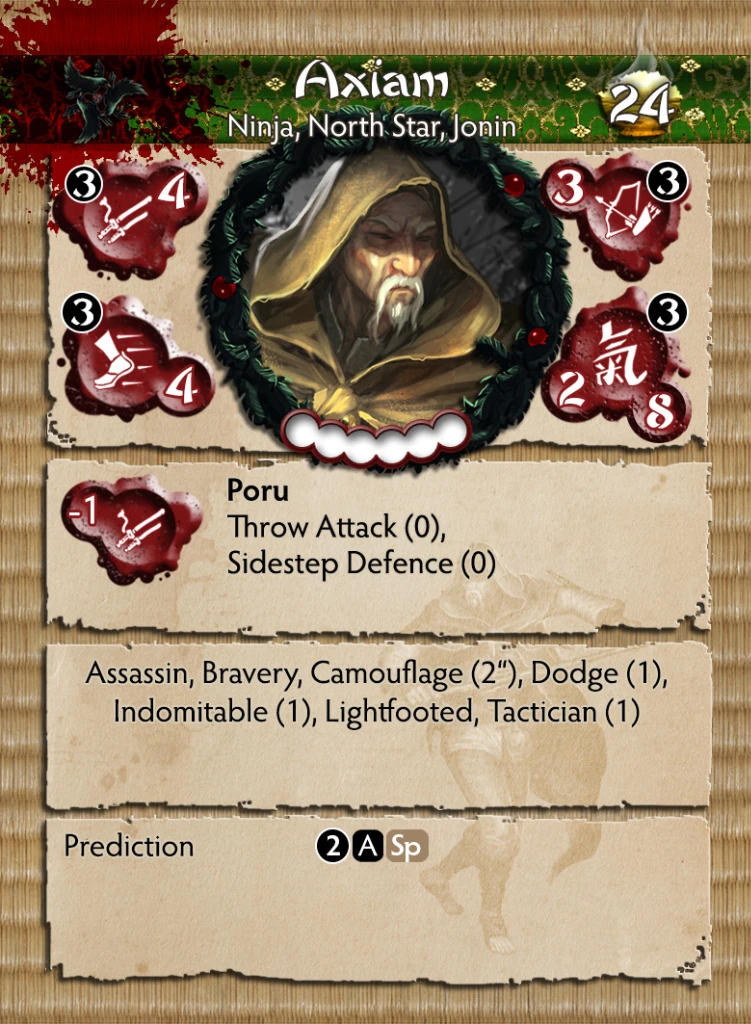 Axiam is a Jonin or “High Man” in the Shadow Wind Clan. He has proven greater than the Shadow Crows and now teaches those who would be North Star Ninja. Still some missions must be overseen by more experienced hands and Axiam shows why he is fit to teach the next generation with his prodigious skill. In the game Axiam has high melee skill, rare among ninjas and the only North Star model to have such high base statistic. His range of abilities is unparalleled as he can use any Feat of any North Star Ninja. He adds to this unpredictability with his Equipment rule allowing you to choose an Equipment Card mid game to suit the exact
