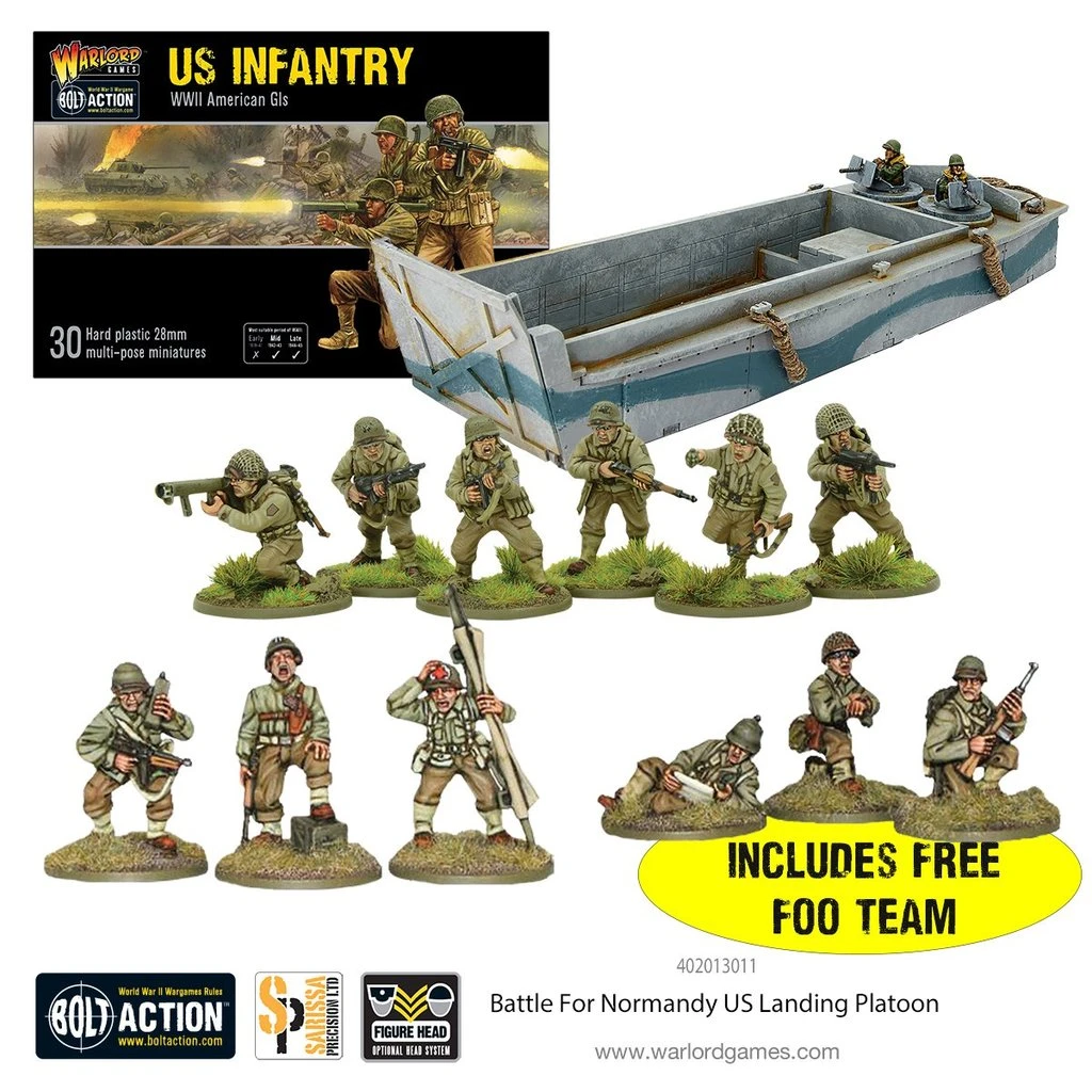 In this US Landing Platoon set youโll get the new infantry platoon box PLUS: US Army Command, a Landing Craft Vehicle Personnel (LCVP) with 2 MMG Crew and a FREE Forward Observation Officer (FOO)!
