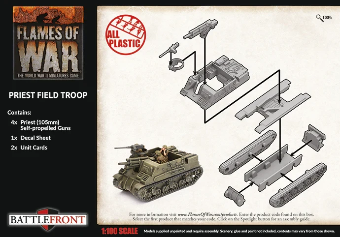 Contains: 4x Priest (105mm) Self-propelled Guns, 1x Decal Sheet and 2x Unit Cards.