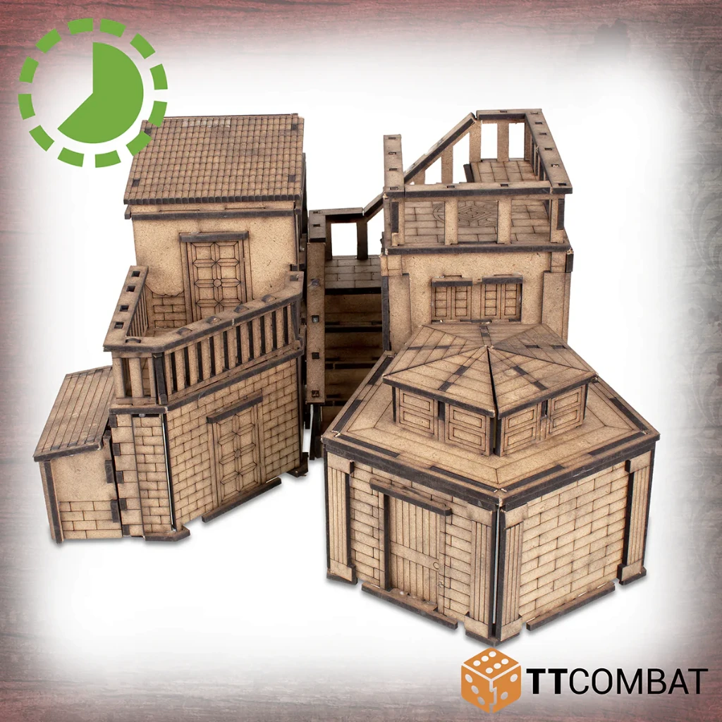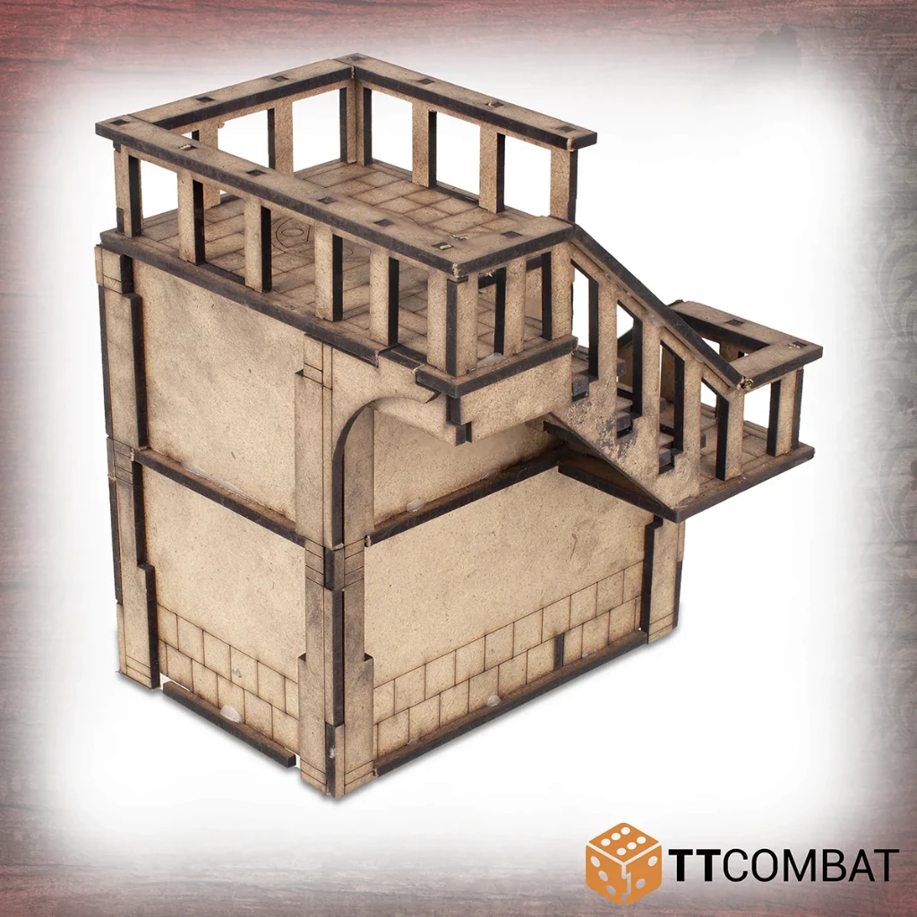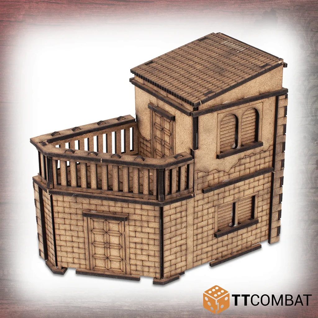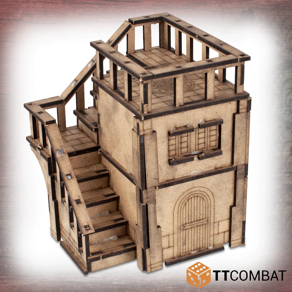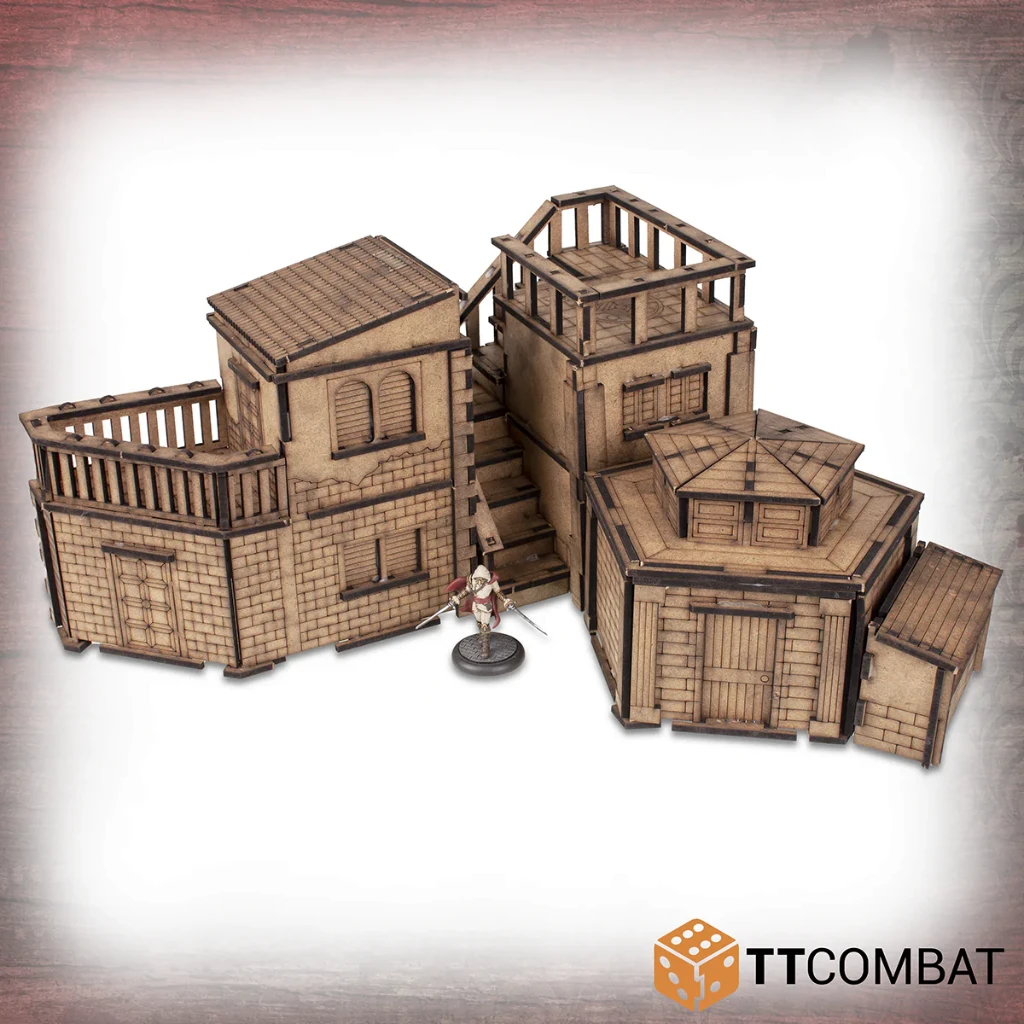 This kit isΒ made from 3mm MDF and has been designed for Carnevale, using multiple storeys to climb and jump, and roofs at easy angles so that miniatures will not fall off when darting across the Venetian skyline.Β It is aΒ great piece of scenery to use with other 28-32mm games.