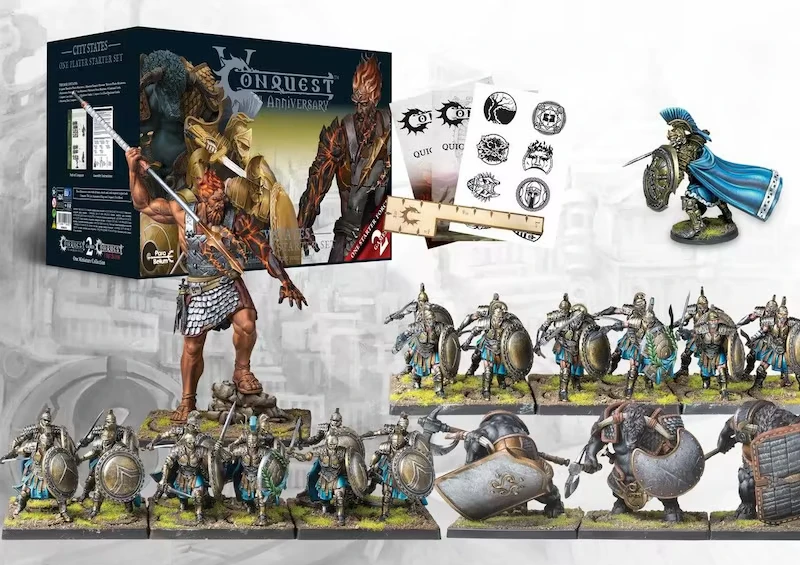 A Supercharged 1 player starter ready to play a game of First Blood or The Last Argument of Kings. This City States set is loaded with a complete stand of 12 Thorakites and Agema, the Polemarch and 3 Minotaurs Haspits and an Haephestian! Each starter set will have a very well built First Blood army as well as a great beginning set to play a game of Last Argument of Kings. Included in this set are quick start guides for First Blood II and TLAOK II, along with all assembly instructions, a great path of Conquest guide, a 5th Anniversary Decal and Measuring Tool, an EA Paper Map and all necessary command cards, bases and stands. How do the City States play? The forces of the City States consist of a strong core of rigorously trained and drilled soldiers supported by an assortment of hulking Minotaurs, towering spellcasting giants and mechanically enhanced veteran warriors. Although lacking strong missile support and with only one Cavalry option, the infantry core of the City States brings a plethora of troop types, formations and Special Rules to be pound-for-pound one of the most efficient infantry forces in the game. When playing with the City States it is important to protect your vulnerable flanks and engage your Infantry line as soon as possible. Once in combat the Faction’s unique Strategic Stack will allow you to forfeit an Activation in one front to subsequently pressure and Activate twice on another. Finally, you can fine tune the defensive or offensive output of your infantry formations by adding Minotaurs within their formations!
