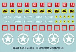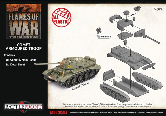 Includes five plastic Comet Tanks, one Decal Sheet and one Plastic Tank Commander Sprue.