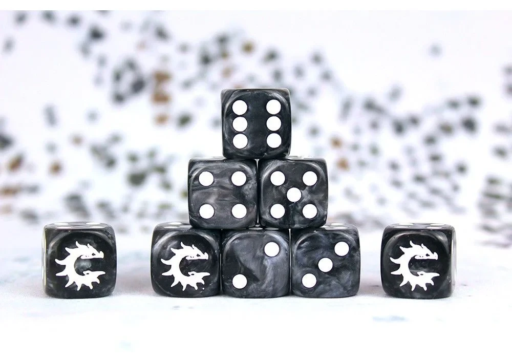 These contain a mixture of ancient greys swirled with deep blacks and inlaid with an easily readable white; resin 16mm dice.