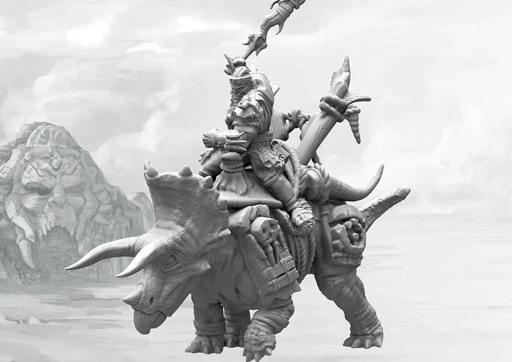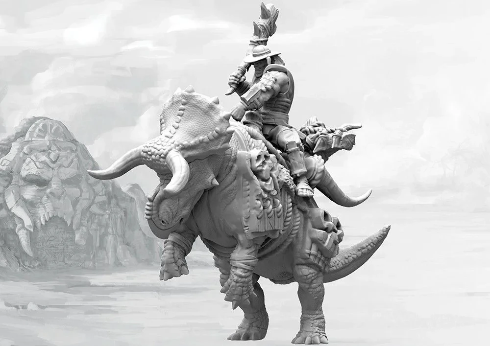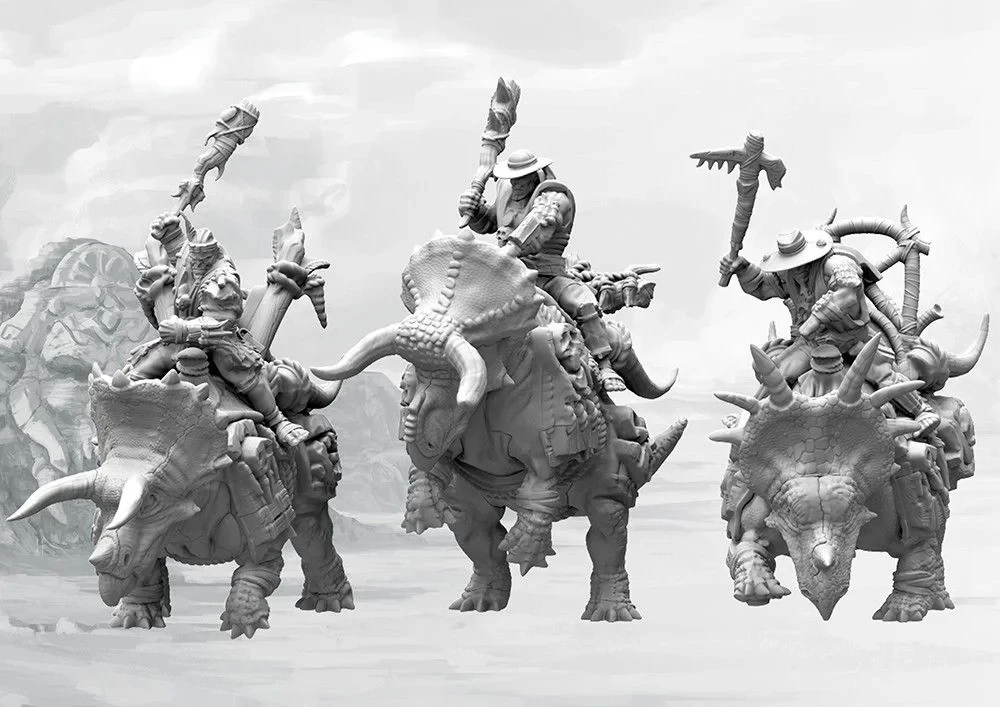 While female Speakers display an admirable affinity to the carnivorous Raptors that dwell within their primal lands, they are not the only cavalry the W’adrhun can bring to bear. Riding juvenile Brontoceratops (the elder beasts being too stubborn and docile to be goaded to battle) the Thunder Riders descend on the enemy formations in an unstoppable avalanche of muscle, crest and violence. The sheer power and impact these mounts can bring to bear as they stampede and trample enemy lines has earned these young riders a terrifying reputation that belies their years.