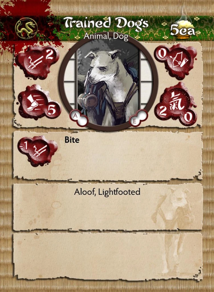 The Hare Clan are Masters of the Art of War. For them, it has become a life-long scholarly pursuit. They seek to turn oft-overlooked components into assets on the battlefield. Take, for instance, the humble dog not so humble in the hands of the Hare Clan. They have long been trained to fulfil a variety of battlefield roles. Some are messengers that go from tent to tent or position to position delivering vital messages or pieces of pertinent information. Some dogs are used to guard the camps at night, equipped to sniff out the enemy or any would-be infiltrators or assassins. Dog-handlers are Ashigaru and may operate with several dogs in a pack depending on the task at hand. Edogowa and his dogs are used to scout ahead, getting the lay of the land then sending the information back to their lines.