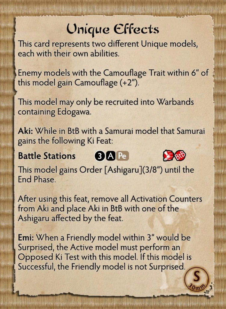 A Prefecture warband can benefit significantly from having Edogawa and his dogs on their side. Aki is a messenger dog running notes back and forth. With a Samurai in the fold, they gain the powerful Order trait, allowing up to three Ashigaru to gain an additional activation. Emi, on the other hand, is a highly trained guard dog, so if anyone tries to Surprise a friendly model, it will first have to Test against Emi or have their advantage negated.