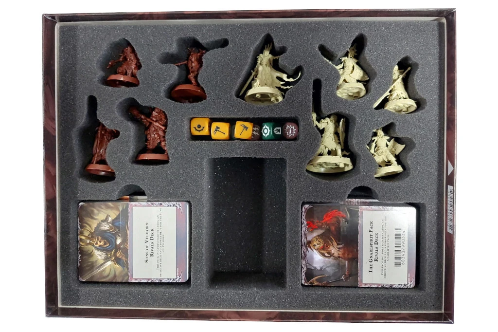 The presented product is a foam tray that provides space for all miniatures and gaming accessories from the core set box of Warhammer Underworlds: Gnarlwood.