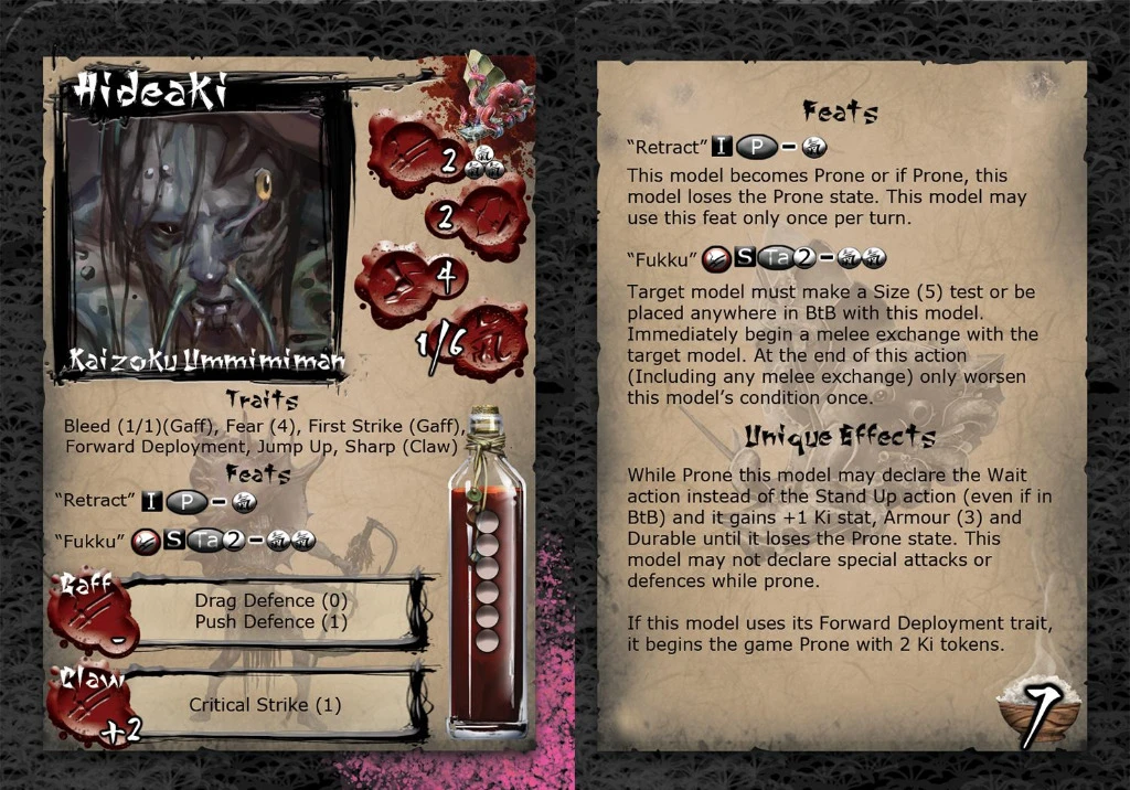 Hideaki was always known as a bit of a melancholic soul. He has treated his sea blessing, seen as an honour to the clan, with his usual lack of fervour. He does however long for the day when the process is complete and he has the strength needed to move his shell as he would like. Hideaki quickly loses any resentment for his shell when it helps him avoid danger, and the speed that he can switch between safety and pressing the attack can surprise those that face him.Â