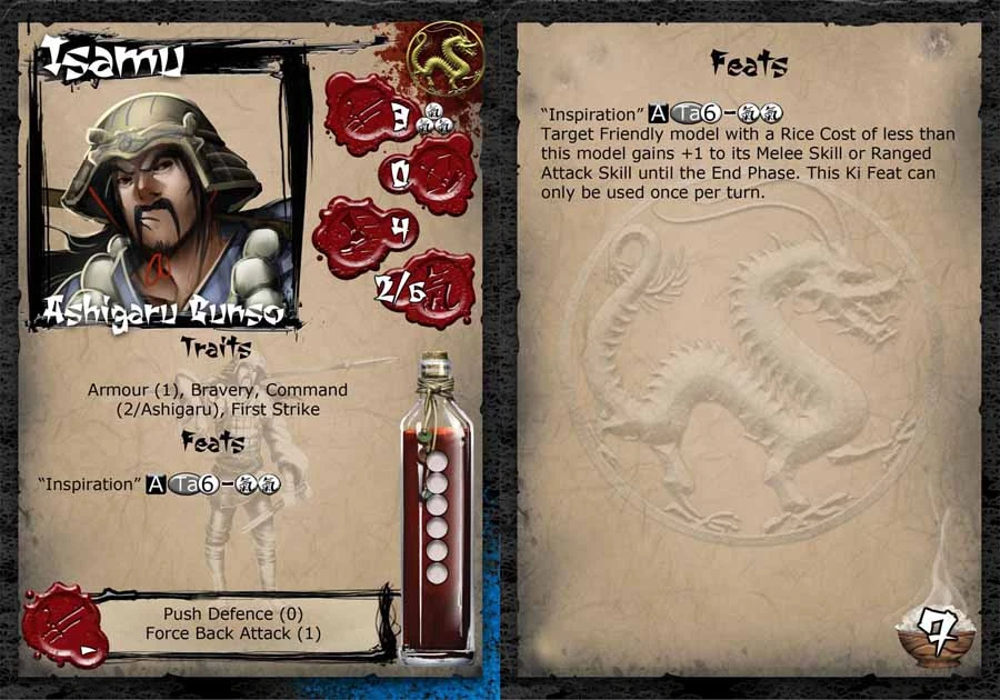 A veteran of the Dragon wars, tales of his courage at the battle of Hendai are still told today in the streets of Tsumaga. He had led the life of a fisherman after the first war until the call from Ryu came, summoning all goshi back to service in this new time of strife. From an early age Isamu exuded an air of authority and a calm head in the heat of the moment. It came as no surprise that he was raised to the rank of Gunso quickly during his first term of service to the Takashi clan, a position he quickly settled into. His experience and presence imbuing his soldiers with a confidence and courage to fight on and turn the tide of battle for the Dragon clan.ย