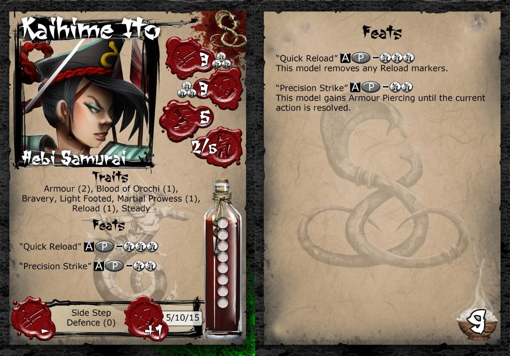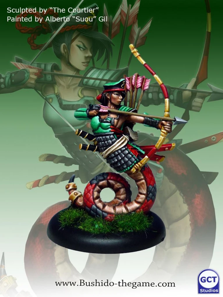 Orochi found Kaihime a worthy recipient of her gifts and bestowed upon this deadly samurai archer the means to carry out her will. Her keen eye and swift arm sew dead across the battlefield. Her arrows find their way through even the toughest Minimoto armour and if the cold Ito steel doesn’t finish her unlucky targets, Orochi’s blood soon devourers them from inside, leaving those praying for a swift end.