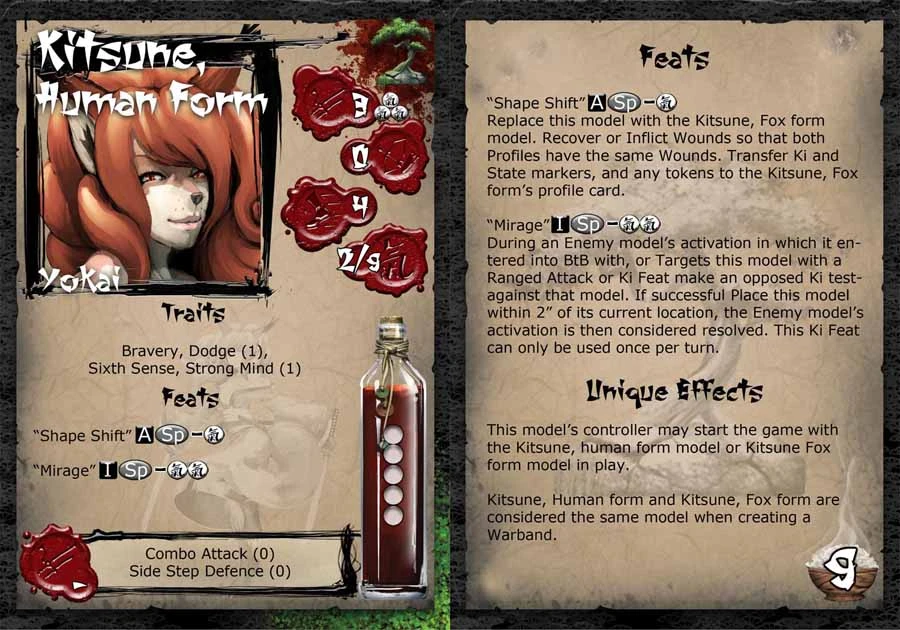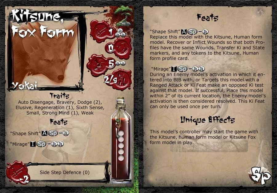 Blister contains one Kitsune miniature, one Fox form miniature, two 30mm bases and two full colour profile cards.