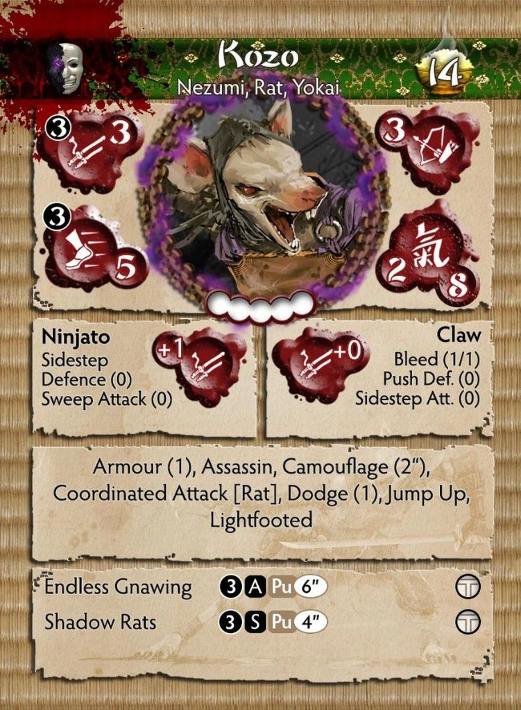 While the low rice cost of this model means it is a good melee model, its Ki Feats allow some unusual plays to surprise your opponents. Endless Gnawing will enable you to repeatedly attack an enemy model without giving an opponent a chance to respond; combined with a toolbox of Traits and Unique Effects, this is an excellent profile for any budding Rat generals.