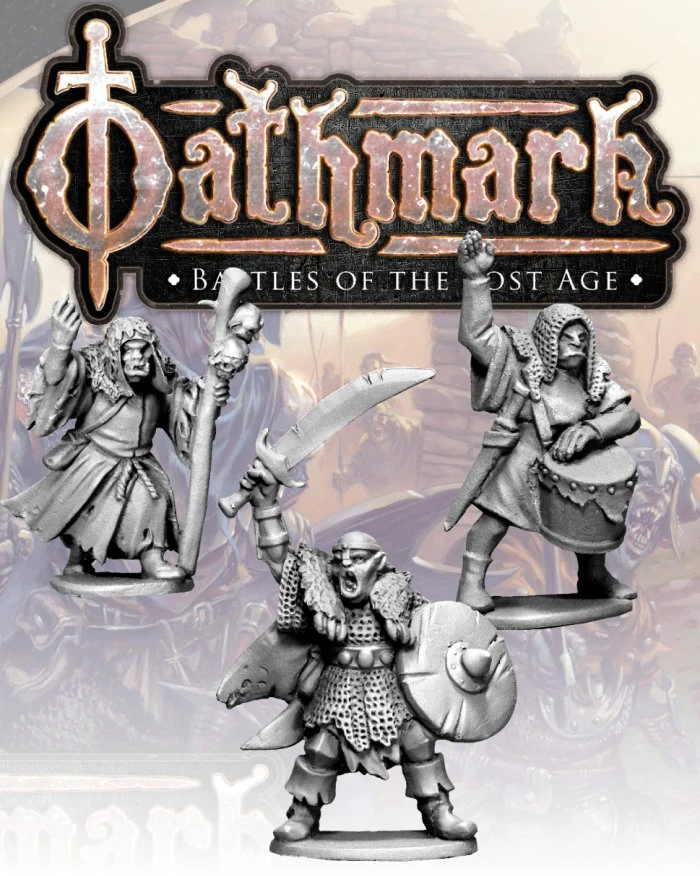 Three metal Orc figures, designed to compliment the Oathmark: Battles of the Lost Age Orc Infantry.