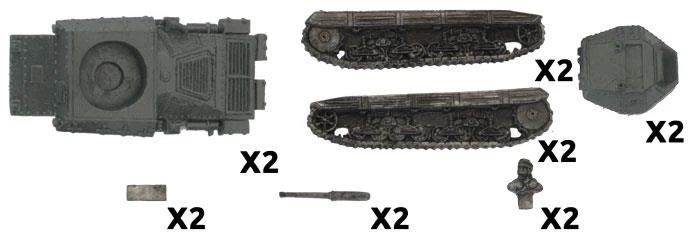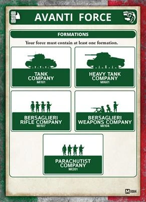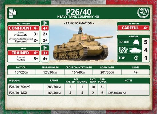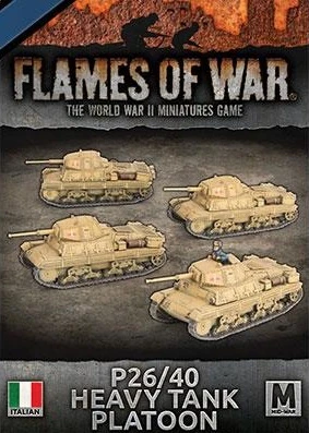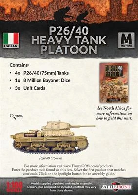 Contains 4x P26/40 (75mm) Tanks, 1x 8 Million Bayonet Dice and 3x Unit Cards
