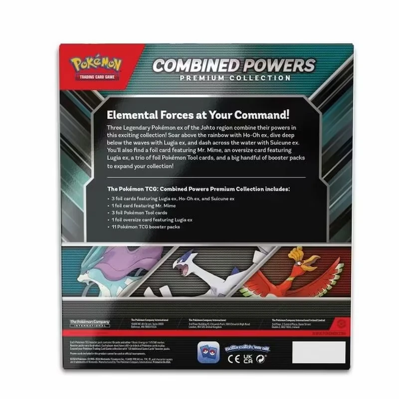 Three Legendary Pokémon ex of the Johto region combine their powers in this exciting collection! Soar above the rainbow with Ho-Oh ex, dive deep below the waves with Lugia ex, and dash across the water with Suicune ex. You’ll also find a foil card featuring Mr. Mime, an oversize card featuring Lugia ex, a trio of foil Pokémon Tool cards, and a big handful of booster packs to expand your collection!