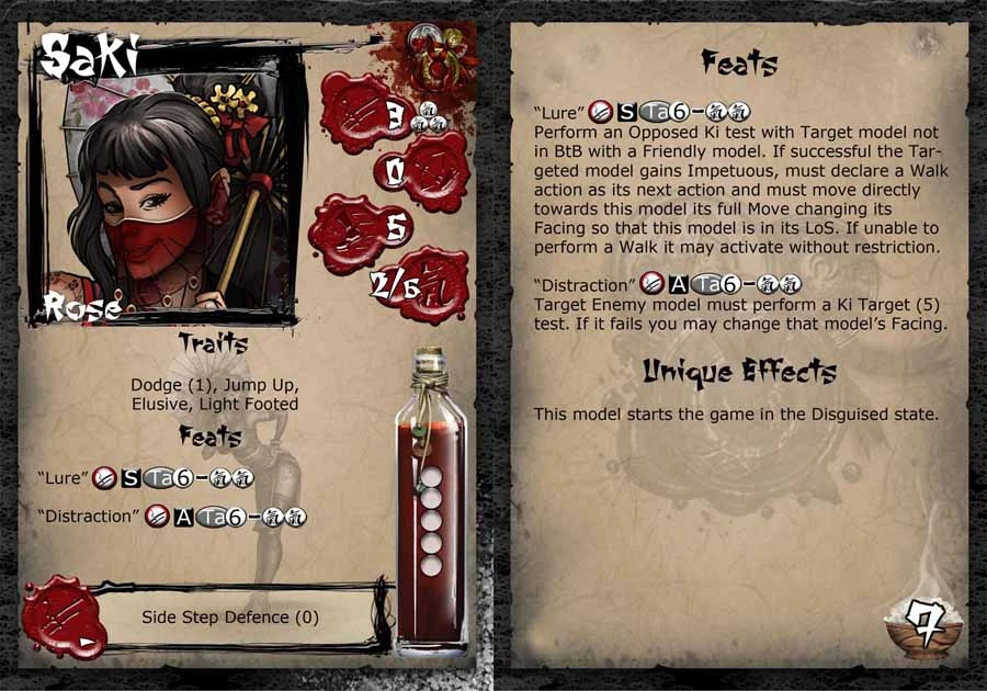 The reach of the Jade Roses stretches far beyond the city of Jima. It is difficult to find an individual in a position of power, man or woman who hasn’t tasted or been tempted by the sweet smell and charms of a beautiful rose. No one knows exactly the training techniques that the Jade Rose implements and many suggest that their charisma and manipulative powers are supernatural and the result of some powerful enchantment. Of course no Rose would ever disclose this information such is their devotion to the Gumi. Saki is a master at the art of suggestion, without uttering a word she can draw the attention of any unlucky enough to be selected for her wiles, stumbling blindly after her in the heat of battle.Â