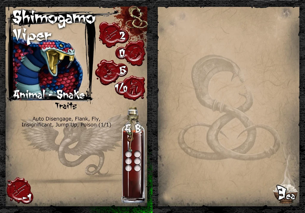 The island of Izu is one of the less habitable places in the whole of the Jwar Isles, bestowed upon the Ito as a slight by the Eagle clan to make it clear to all, including their subordinate clan, who rules. A broken landscape with little arable land for farming, brimming with danger and hazard from the hostile terrain or its inhabitants, beasts unique to the island fill its dense jungles. Beautiful as they are exotic, with colourings to make the royal gardens seem dull in comparison. Amongst the many reptiles lurking in the shadows of the canopy the Shimogama vipers are some of the largest and deadliest. Five foot of muscle, harnessed by great feathery wings enables the snake’s great power and movement, striking without warning and disappearing just as fast. These ancient predators of the jungle are drawn to the service of their mother in times of war.