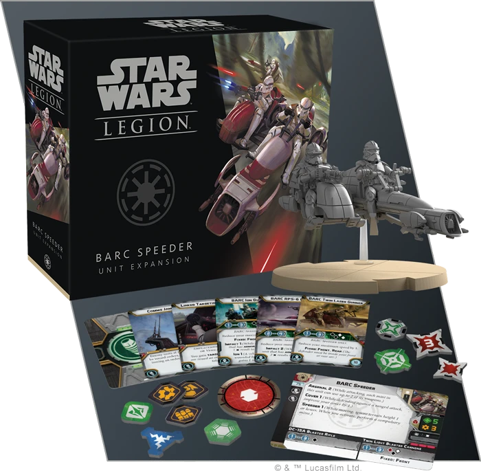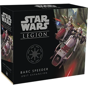 Within the BARC Speeder Unit Expansion, you’ll find one unpainted, finely sculpted BARC speeder miniature identical to the miniature included in the Star Wars: Legion Clone Wars Core Set. If you choose, this miniature can include a sidecar featuring a built-in M-45 Ion Blaster or a Mark II Medium Blaster. Similarly, a Phase I Clone Trooper can fire an RPS-6 rocket launcher from the sidecar. This expansion also includes a unit card and an assortment of six upgrade cards inviting you to outfit your speeder to fit your personal battle plan.