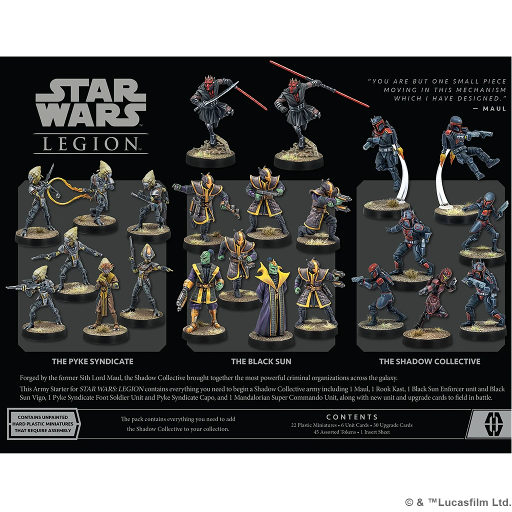 The galaxyโs seedy underbelly comes to Star Wars: Legion with the Shadow Collective Starter Set! This set introduces mercenaries to the game, inviting players to hire units from the notorious Black Sun and Pyke syndicates to join other factionโs armies. Alternatively, Maul himself can unite these disparate criminals under the banner of the Shadow Collective and lead them as a standalone force. Alongside his Mandalorian Super Commandos, they form a threat that could bring the galaxy to its knees.