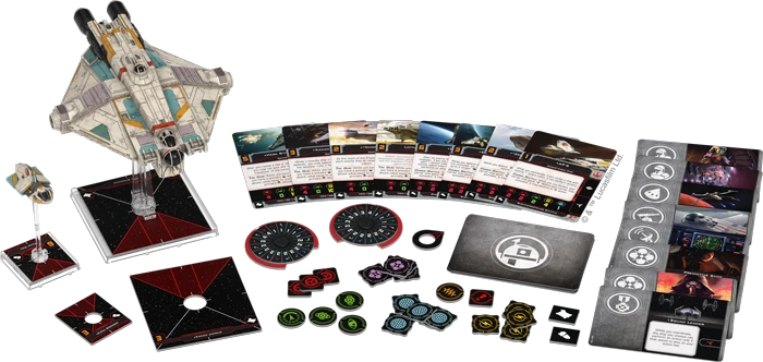 You’ll find both a VCX-100 light freighter miniature and a Sheathipede-class shuttle miniature that can physically dock with the larger ship in this expansion, giving you the freedom to fly them separately or as a powerful combined force. Alongside these miniatures, new players will also find reprints of eight ship cards—four for the VCX-100 and four for the Sheathipede-class shuttle—as well as reprints of sixteen upgrade cards to further customize your ships. Finally, four Quick Build cards help you combine ships and and upgrades to get into the battle right away.