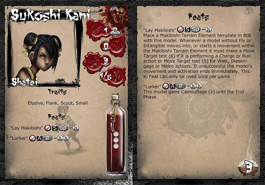 The oyabun of the Silvermoon do not consider age a restriction to the entrance to their service. Many fill their numbers with youngsters eager to establish themselves within the Shatei ranks and prove themselves worthy of their oyabunβs favour. All within the Silvermoon play to their own strengths, and in doing so strengthen their gumi. Sukoshi Kani and Nomi are no different in this respect. Sukoshi, armed with her bag of makibishi, ready to scatter them wide at a momentβs notice to cover a retreat or block a path. Nomi serves as the keen eyes and ears, ready to alert his brethren to approaching or unseen dangers. Their small statures another hindrance turned help, enabling them to sneak into an enemyβs flanks and wreak havoc. Β Β
