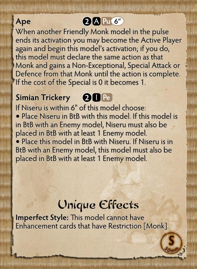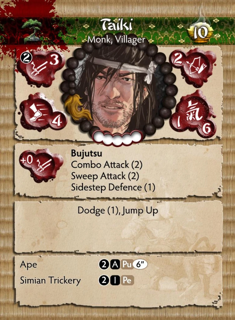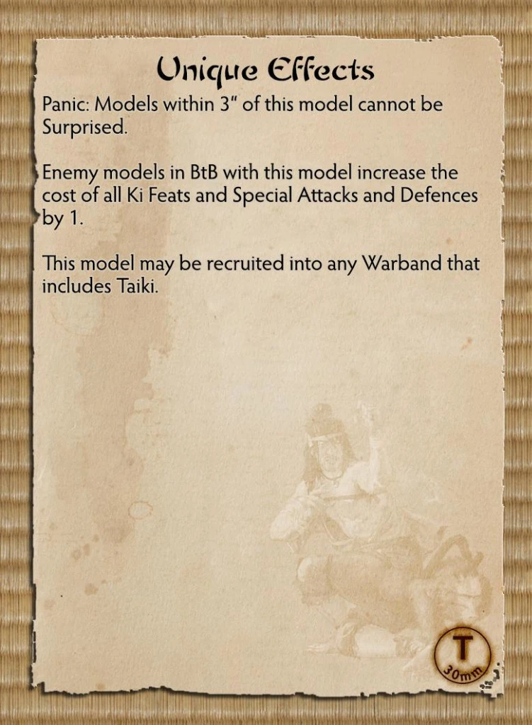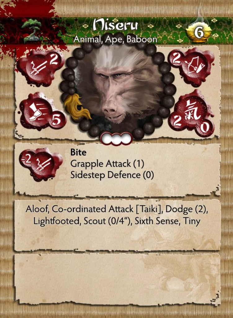 Taiki’s Ape Ki Feat requires a friendly Monk model for Taiki to watch and copy as best he can. This allows you to break the activation order, take TWO activations in a row, and give Taiki additional melee options. Taiki also brings Event-Trap cards to Temple’s Monk themes for the first time. When paired with Niseru, Simian Trickery allows for a wide range of tactical plays that keep your opponent guessing where these models will attack by spreading out then using the feat to outnumber the enemy suddenly. Niseru is more of an annoyance than a combatant, but the negation of Surprise can be a real boon, especially with the recent release of the Shiho. Changing Special Attacks from 0 cost to 1 is a real worry for specific lists; those Takashi now have to pay for Critical Attack!