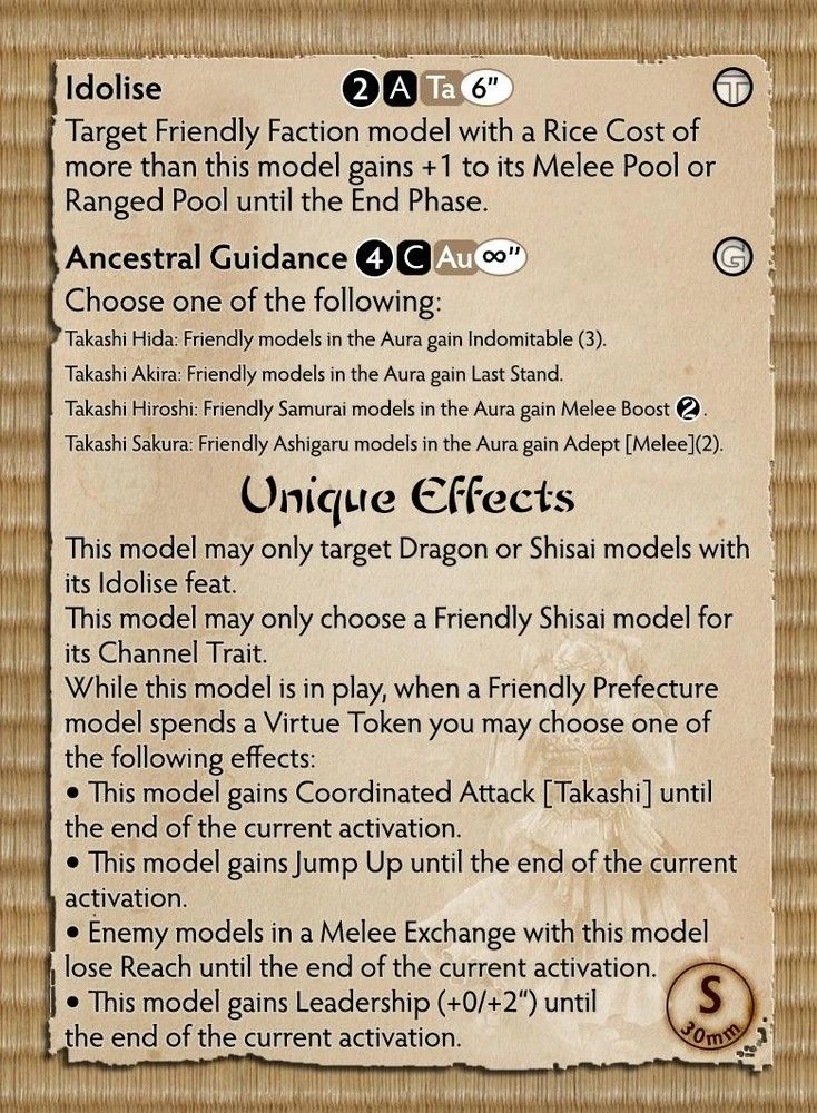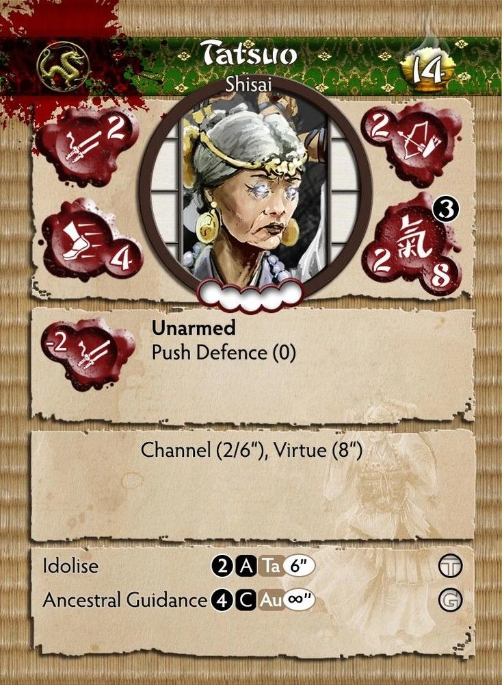 Though hailing from a noble house, Tatsuo always felt destined for the priesthood, and so she faithfully served her local Michi shrine, rising through the ranks with age. She felt she belonged there, happy in her work, hoping to remain there for the rest of her days. But all that changed when she saw a dragonโฆwhether she was asleep and dreaming or it was real, Tatsuo does not know, but regardless she followed as fast as her feet allowed despite its mighty wings. Her journey, possibly real, possibly imagined, took her through parts of Jwar she never knew existed until, eventually, the dragon landed outside the Temple of the Heavenly Dragon. She immediately made the connection between the two and, bowing to the magnificent sentinel, swore her solemn service to it and those of the temple. That secretive sect welcomed her arrival revealing new mysteries to her. Over time she far exceeded her previous abilities and can now summon the greatest of Takashi Ancestors to aid the clan in its hour of need.