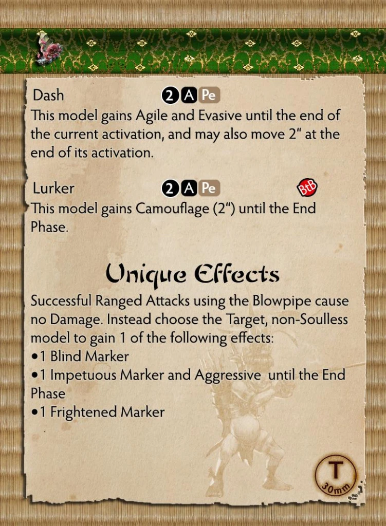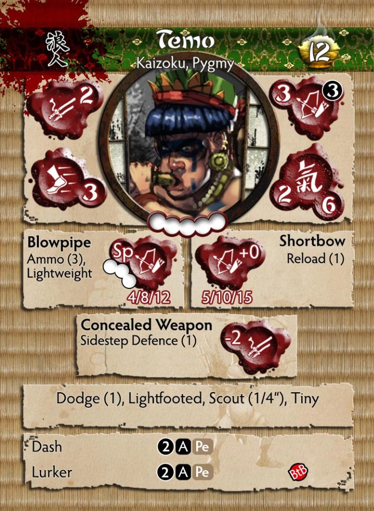 Temo fled first from the brutal enslavement of the Ito then from the worker camps of the Silvermoon. A resourceful seaman who holds and practises with great honour the knowledge of the jungle plants passed down through generations. It is these exotic combinations that he uses to dose his distinct blowpipe, the effects of the those darted vary from panic to rage dependant on the dart used.