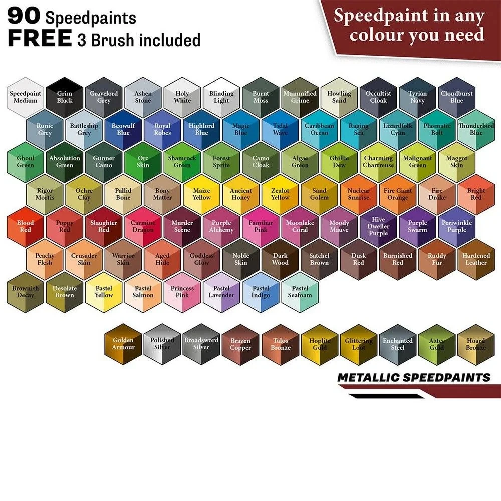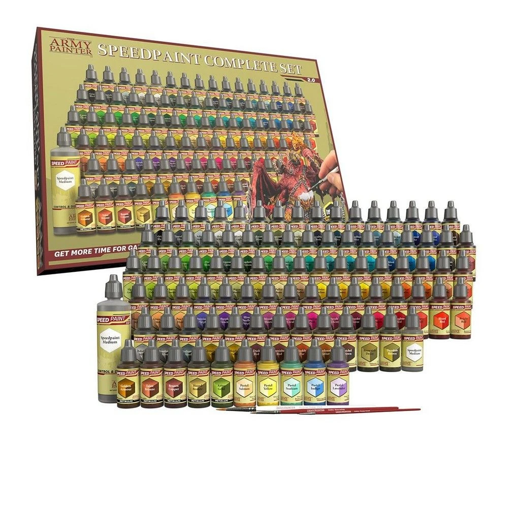 The mecca of one-coat paint solution sets, the Speedpaint Complete Set features every Speedpaint colour in existence! That includes all 23 original colours, 44 newly developed colours, 10 Speedpaint Metallics β AND β 12 colours designed by Dana Howl, Watch It Paint It, and Goobertown Hobbies of our Paint Development Team! The set also includes an extra-large 100ml bottle of Speedpaint Medium.