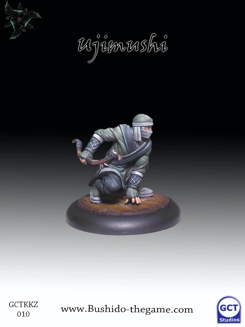 Like all novices of the Kage Kaze Zoku, Ujimushi is mercilessly and relentlessly drilled in the arts of the Kage. Although adept in all Zoku martial weapons he has chosen the short bow as his preferred weapon. On missions he strives to master the skills of the veteran ninja, the shadow crows, with whom he serves, mimicking and practising their movements to aid in his own training.Β
