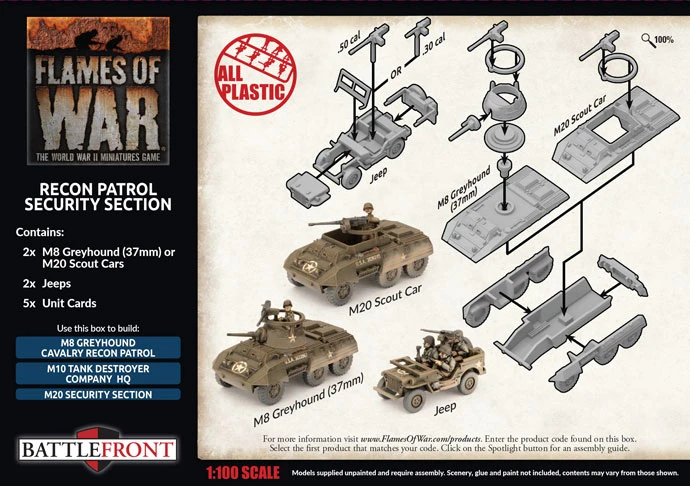 Includes two Plastic M8 Greyhound or M20 Scout Cars, two Plastic Jeeps and five Unit cards.