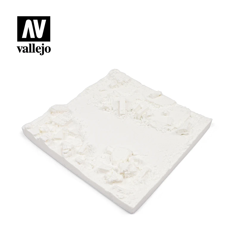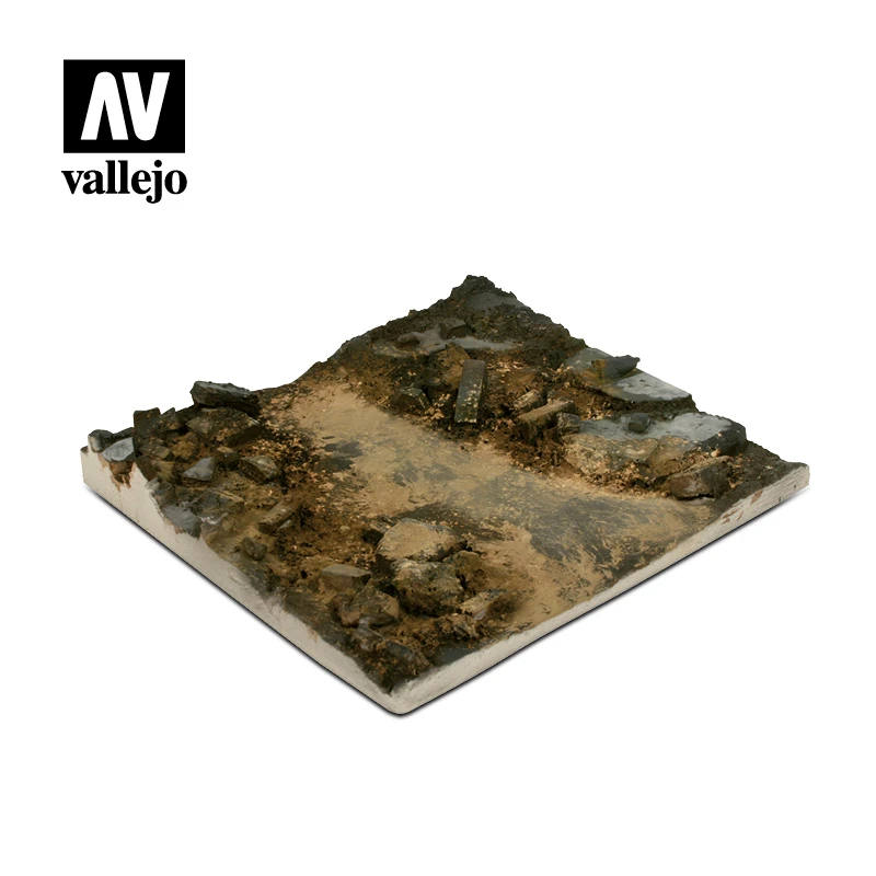 Section of road, cleared amidst ruins, appropriate for placing the remains of a destroyed vehicle, perhaps accompanied by figures and troops in movement, or with science fiction or fantasy themes, any of these can be situated in this environment while the modeller ads as many details as considered suitable and in context.