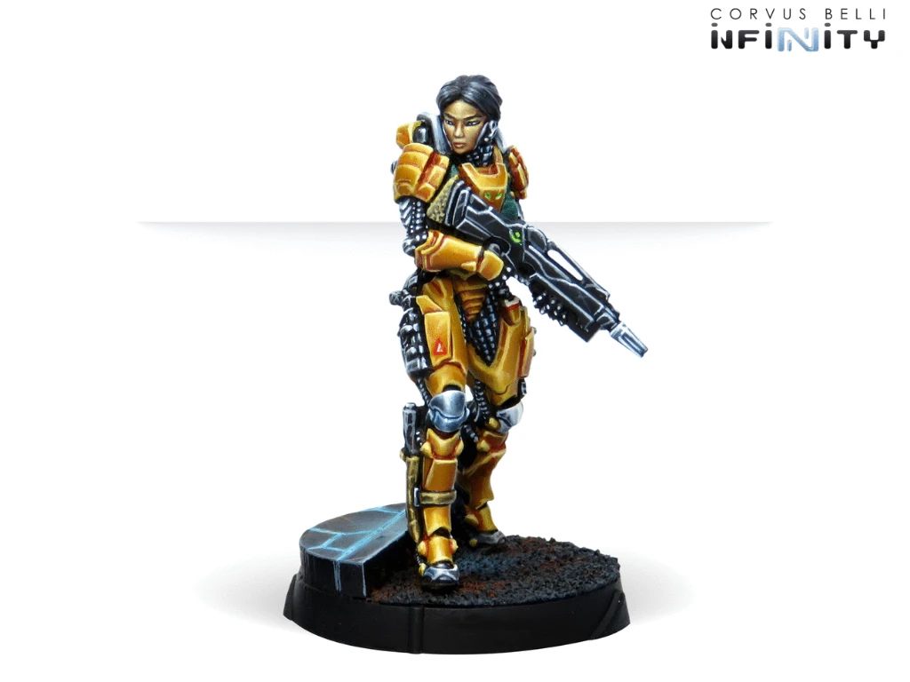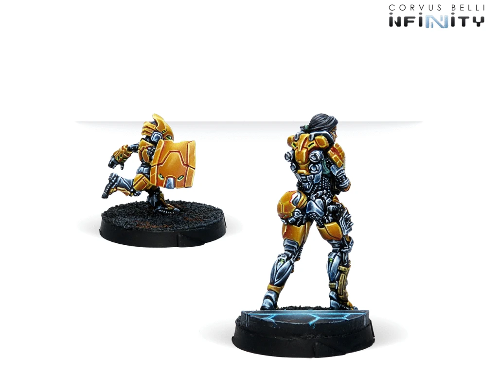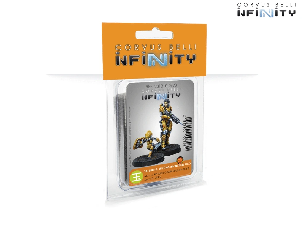 This blister contains two miniatures: One Tai Sheng character with a Breaker Combi Rifle and one TinBot B with Deflector L2. A resilient Forward Observer and powerful addition to Yu Jing’s Invincible Army. She will be our safeguard when our Lieutenant falls thanks to her Chain of Command option.